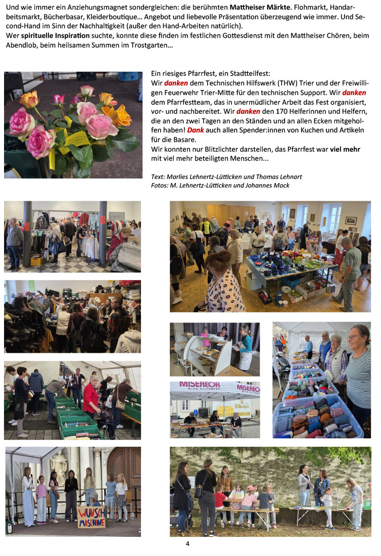Nicht nur in der Pfarrei, sondern auch in der Stadt Trier bekannt und beliebt ist das traditionelle Mattheiser Pfarrfest Anfang September – ein Treffpunkt für viele Menschen, die Begegnung und Geselligkeit suchen, die neugierig sind auf die Angebote der vielen Stände, die die unterschiedlichen Angebote an Speis und Trank schätzen, die gerne Musik hören oder abends in der Krypta Ruhe und Besinnung suchen …